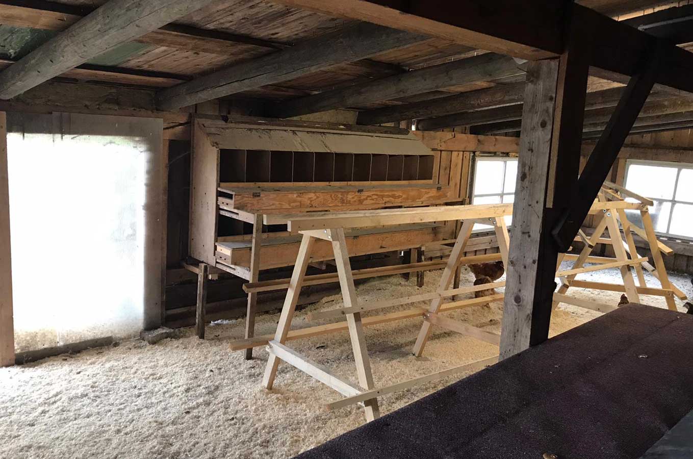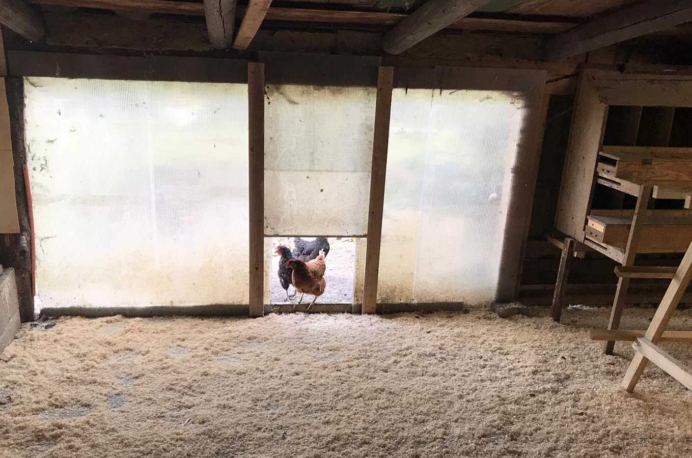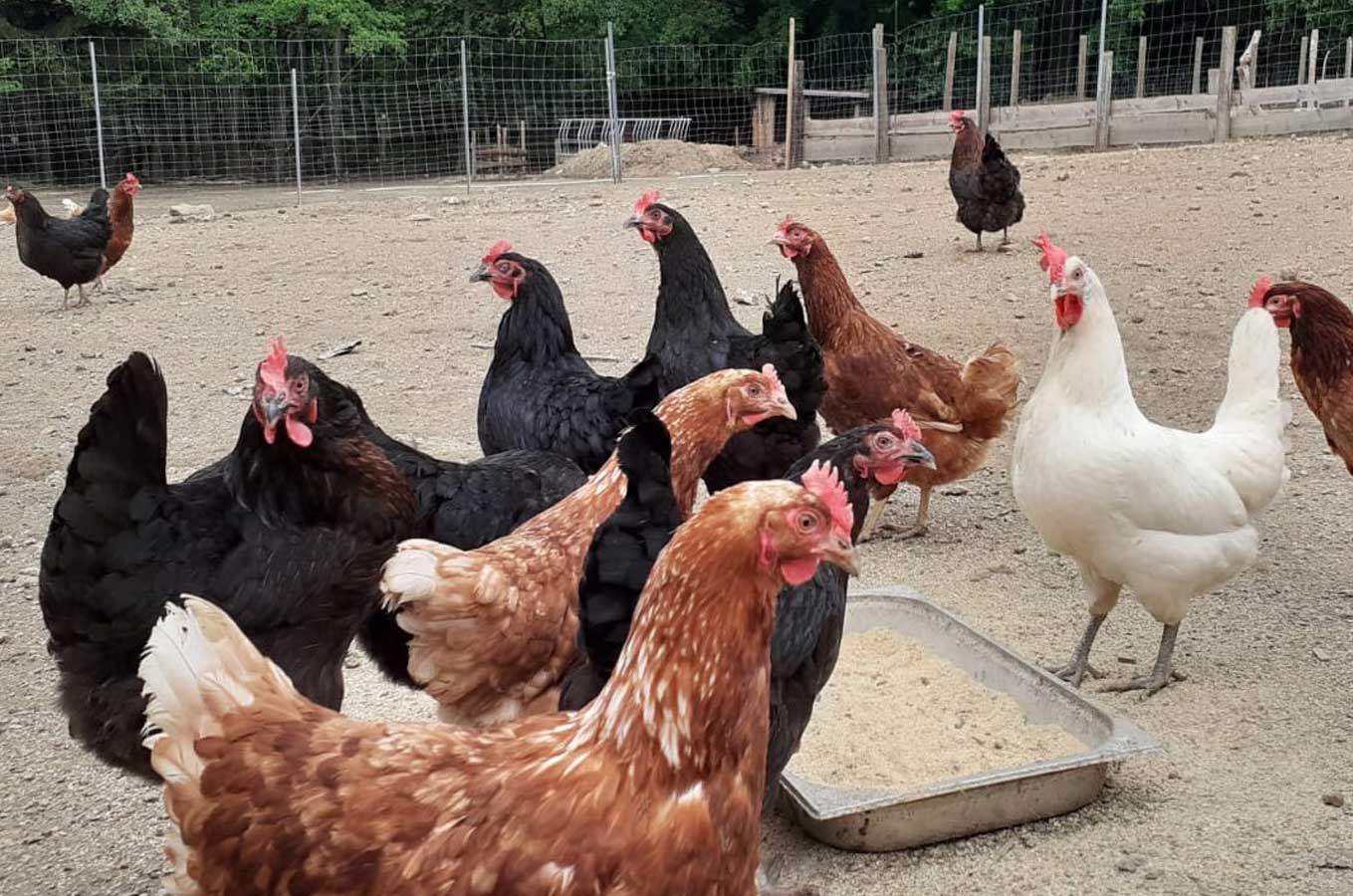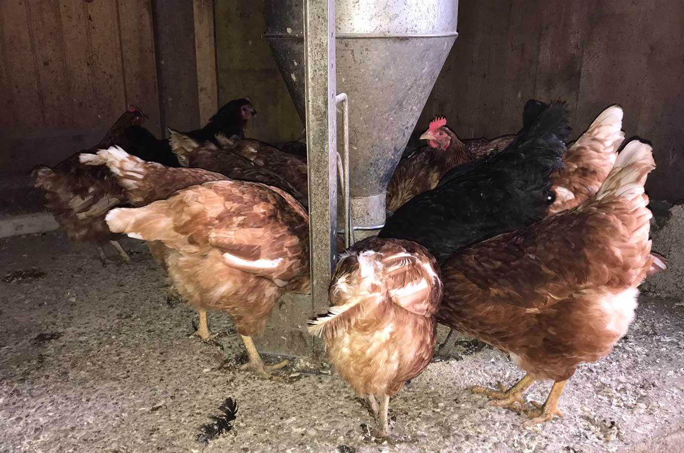 Unsere Legehennen haben großzügigen Auslauf bis in den angrenzenden Wald. Fütterung nur mit genfreiem heimischen Getreide.