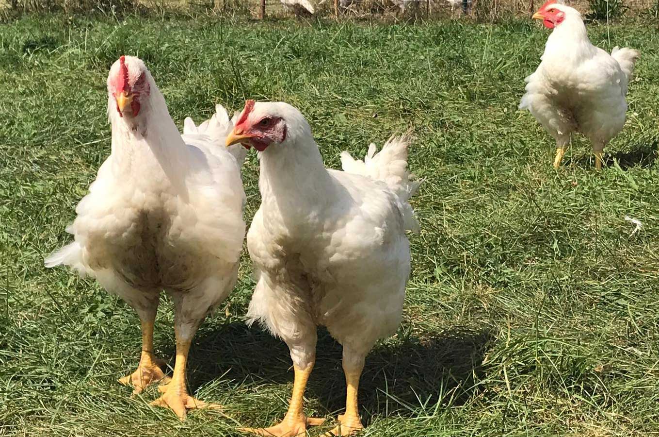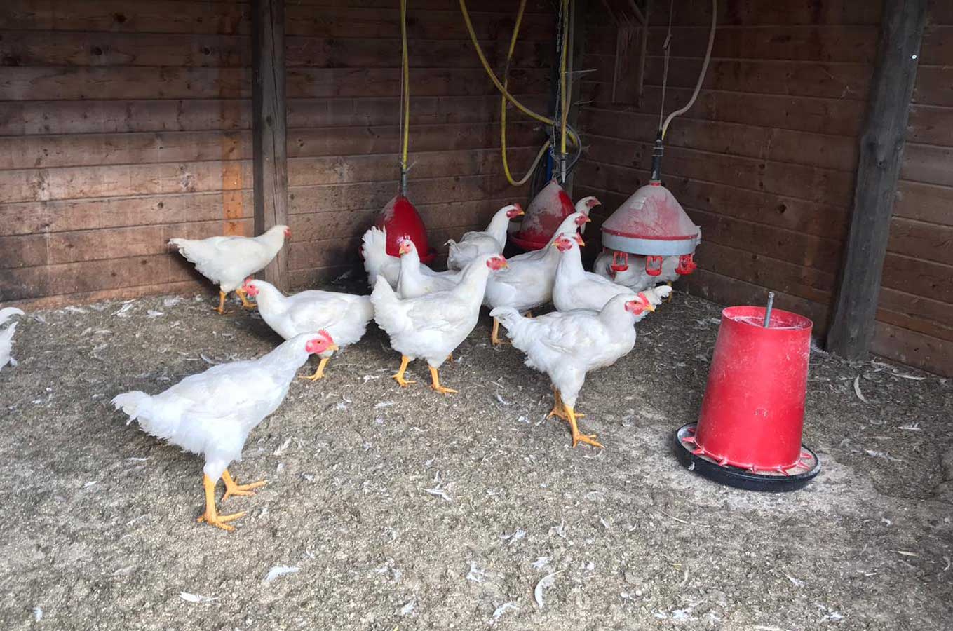 Fütterung mit Weidegras, Gerste und Sojamaismischung aus heimischem genfreiem Anbau, garantiert keine Antibiotika. Daher werden unsere Masthähnchen auch getrennt gehalten.